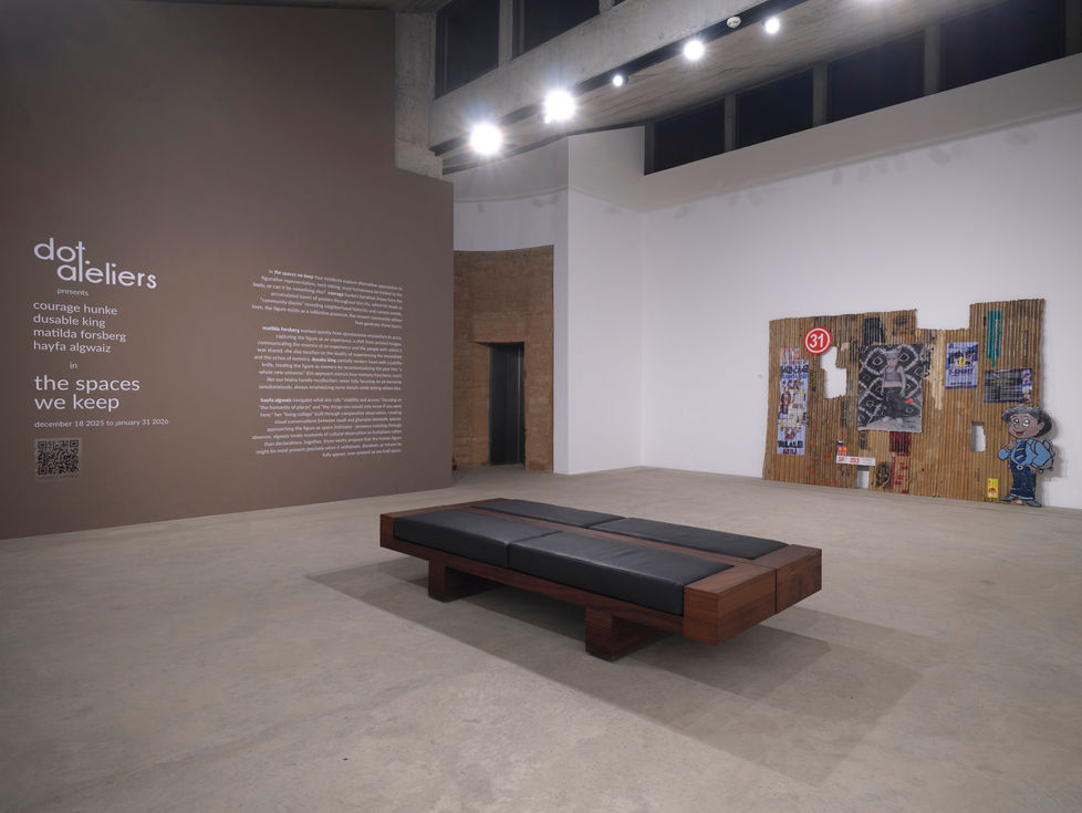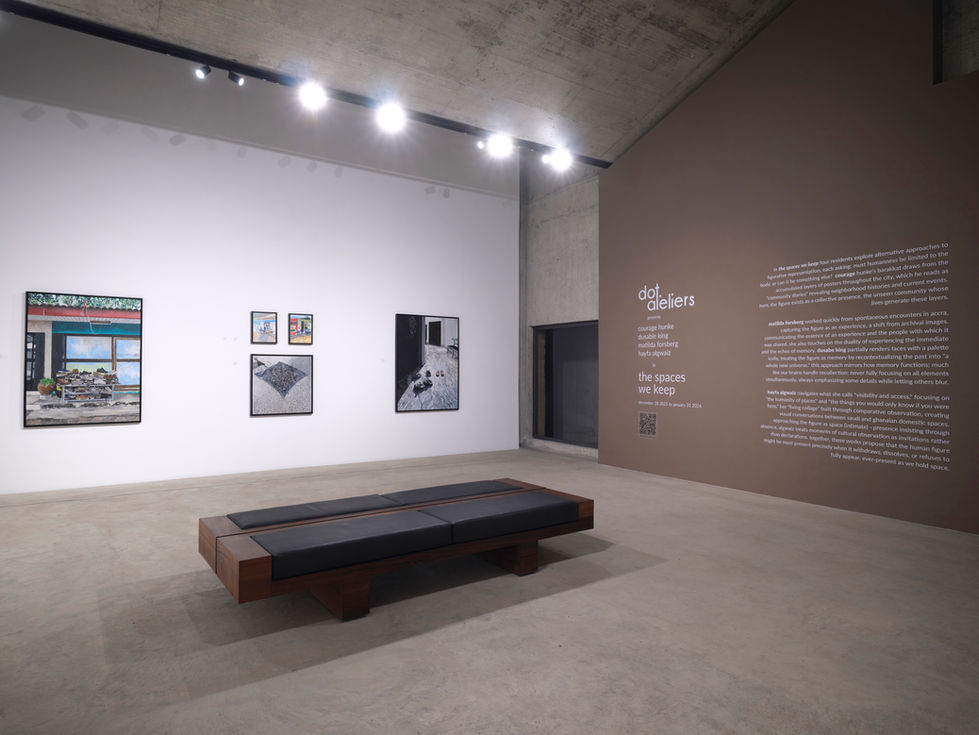 hayfa algwaiz navigates what she calls "visibility and access," focusing on "the humanity of places" and "the things you would only know if you were here." her "living collage" built through comparative observation, creating visual conversations between saudi and ghanaian domestic spaces. approaching the figure as space (intimate) - presence insisting through absence, algwaiz treats moments of cultural observation as invitations rather than declarations. together, these works propose that the human figure might be most present precisely when it withdraws, dissolves, or refuses to fully appear, ever-present as we hold space.